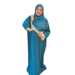 - إسدال سادة باللون البترولي مع طرحة متصلة مزين بجبير ناعم على الأكمام والطرحة ، وسوستة أمامية رقيقة