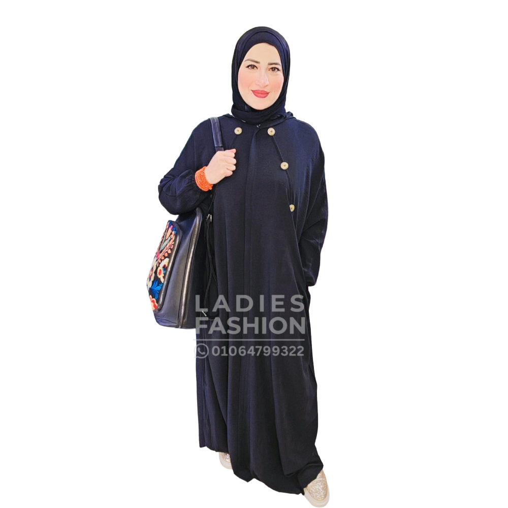 - عباية فضفاضة باللون الأسود بتصميم سادة مع كابيشو متصل وأزرار أمامية