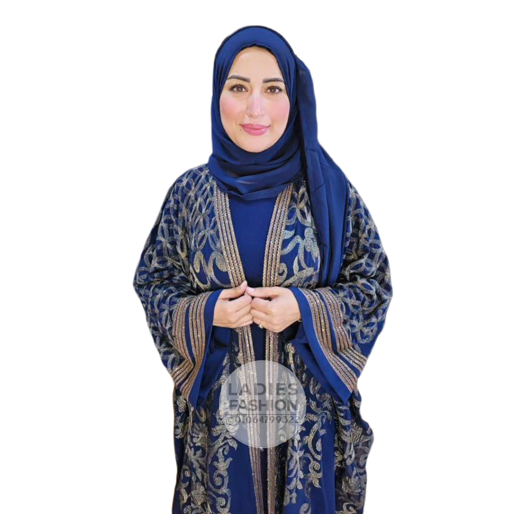 • عباية شيفون فاخرة باللون الكحلي ،مطرزة باللون الذهبي